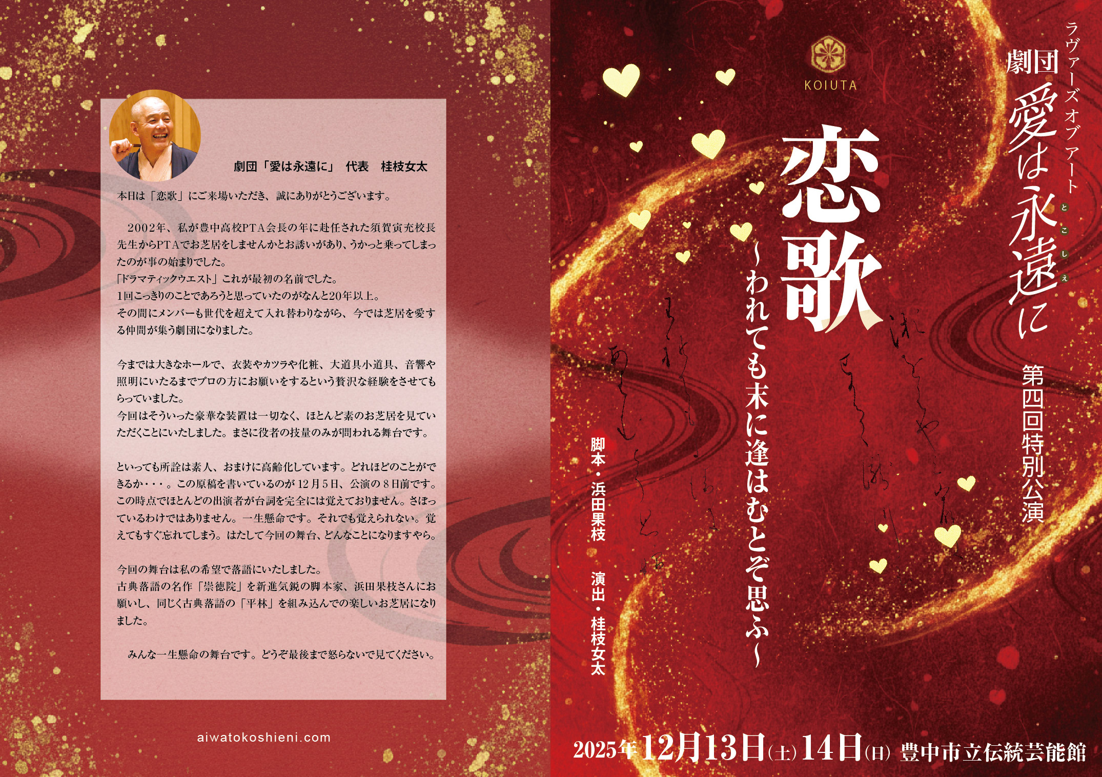 この度私どもは20年間続けてきた『ドラマティックウェスト』の活動名を劇団『愛は永遠に』と改め、